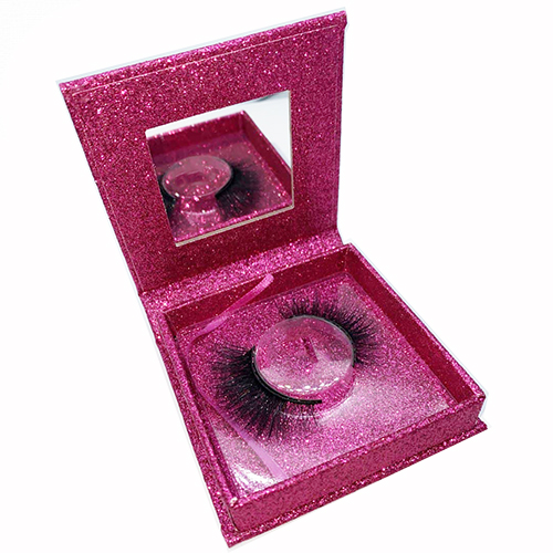 Una cajita de purpurina rosa brillante con espejo en su interior.